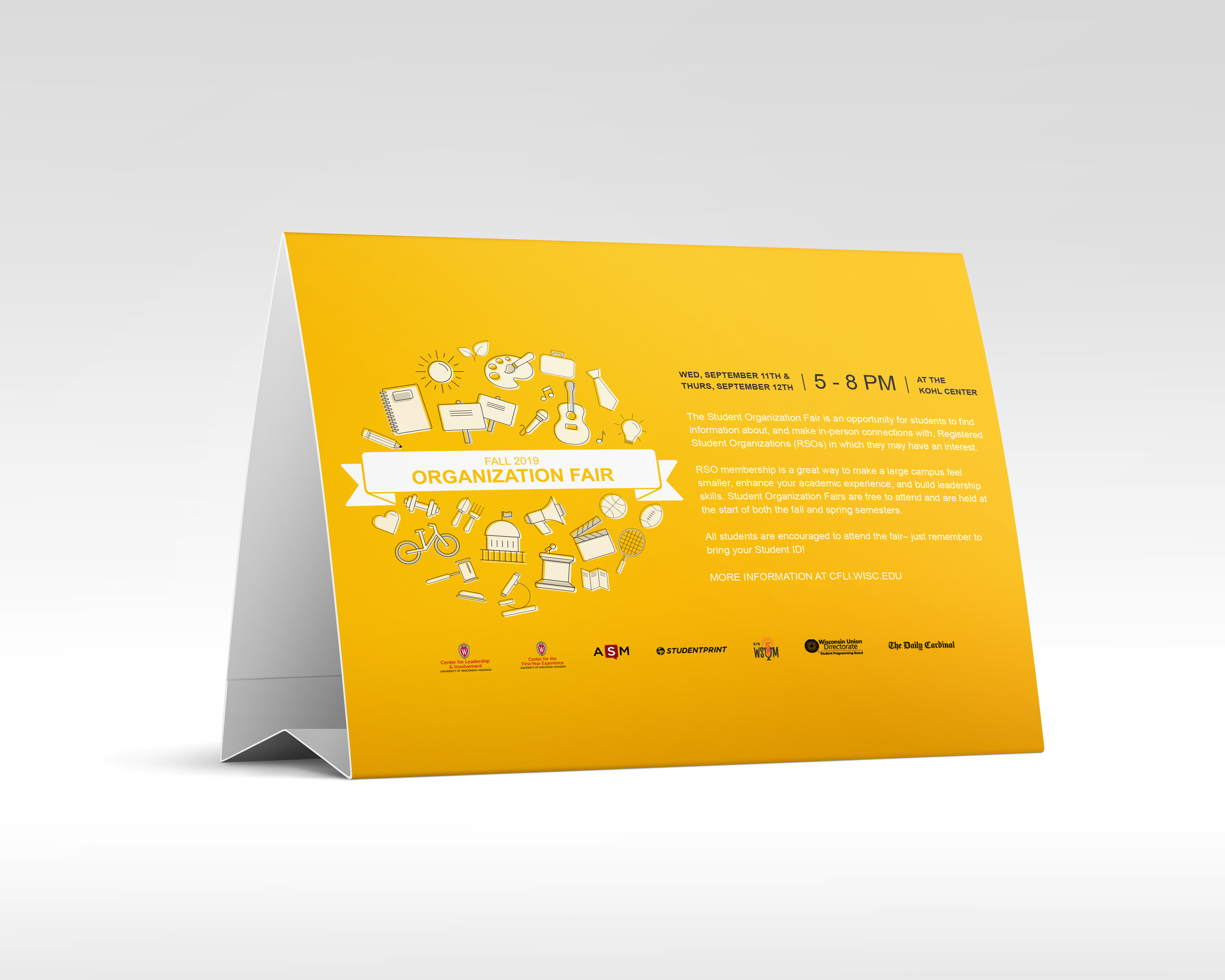 Context: Each semester, UW-Madison's Center for Leadership and Involvement (CfLI) hosts an organization fair for the student body. This fair helps students to build connections that enhance their academic and personal experiences during their time in Madison. I was tasked with creating the visual identity of the 2019-2020 fair, which included various promotional and marketing materials, signage and way-finding.